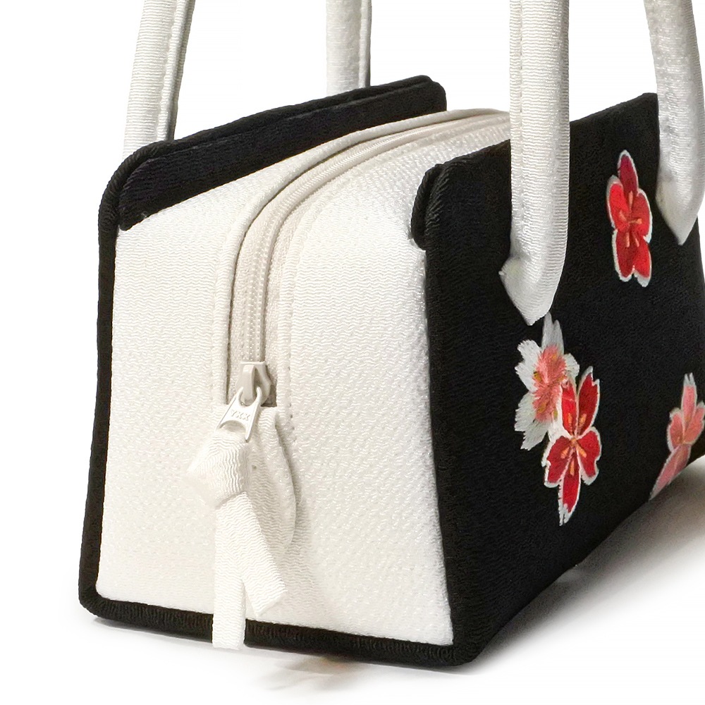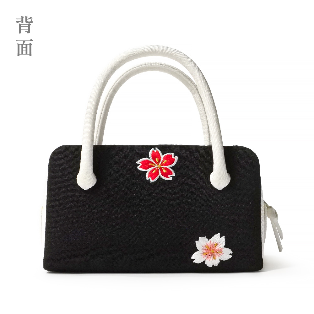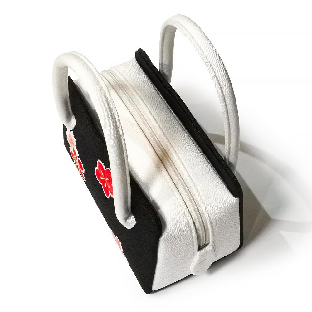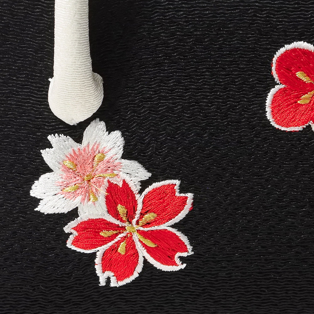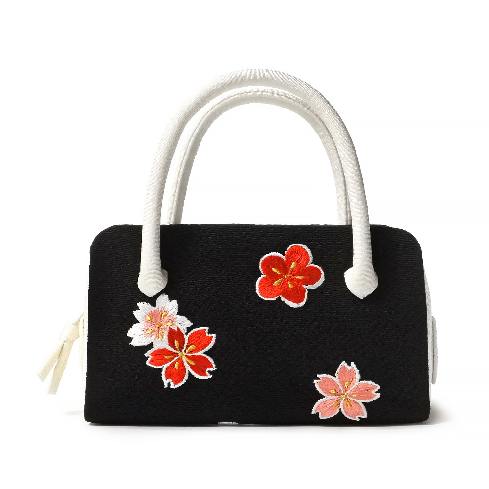 ミニサイズの葵バッグを更に一回り小さくした、ミニミニサイズのバッグです。しっとりとした黒のちりめん地に、梅や桜の刺繍を上品にあしらい、雅な雰囲気を加えました。やわらかくはんなりとしたデザインで、日常の装いや、また晴れ着にもご使用いただけます。大人の方のパーティーバッグとして、またお子様の七五三や十三参り、成人式の振り袖にもお持ちいただけます。