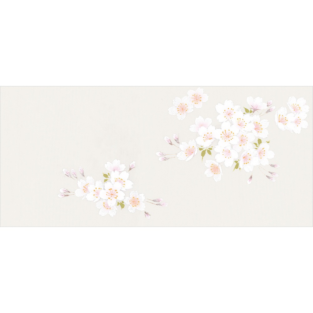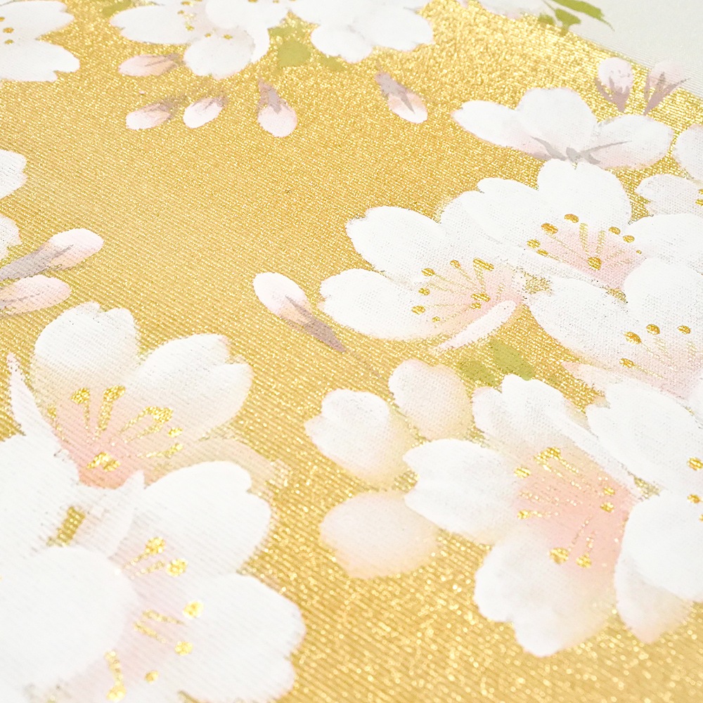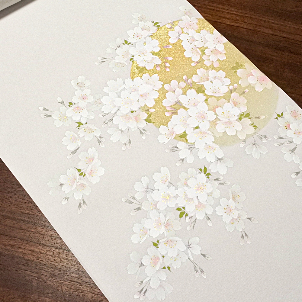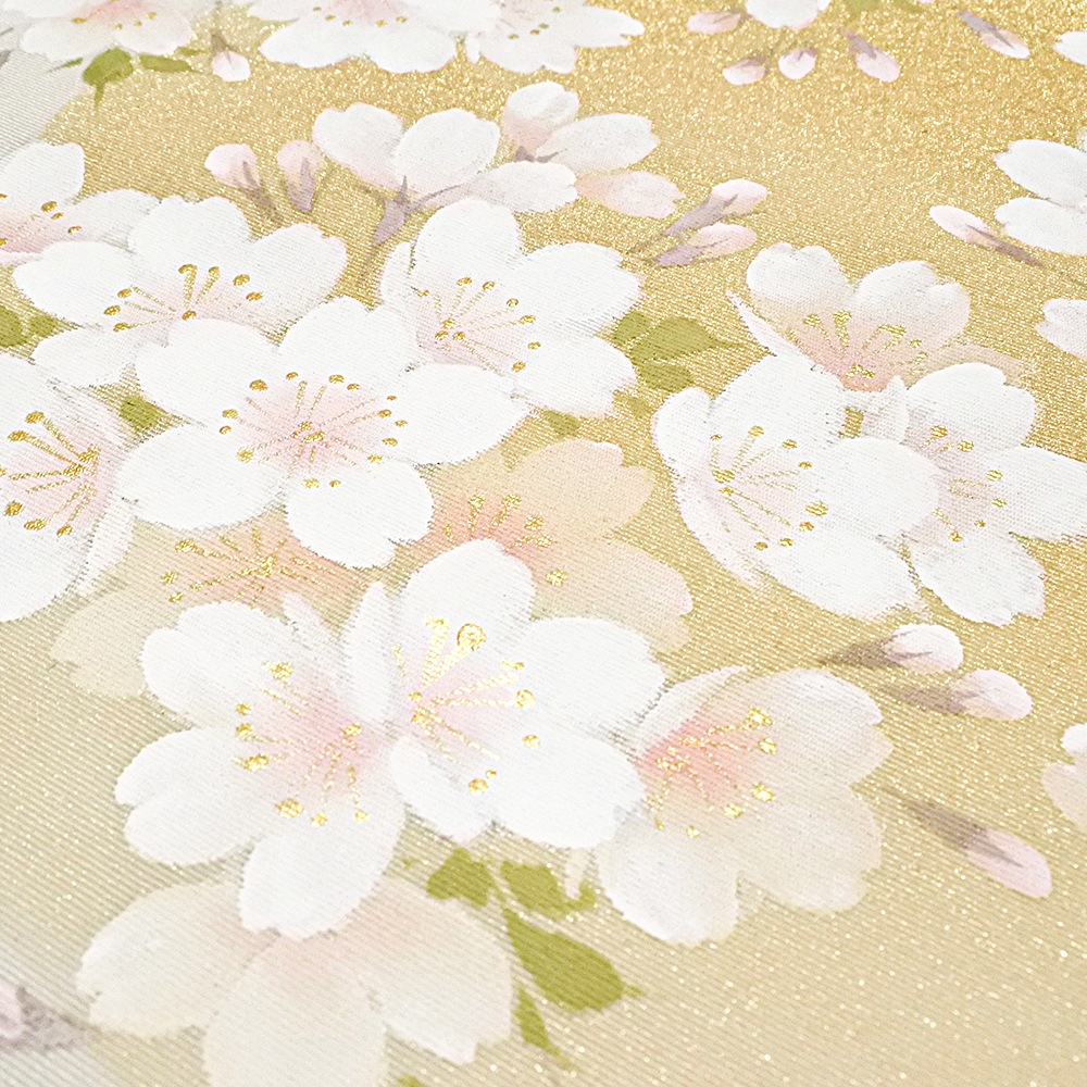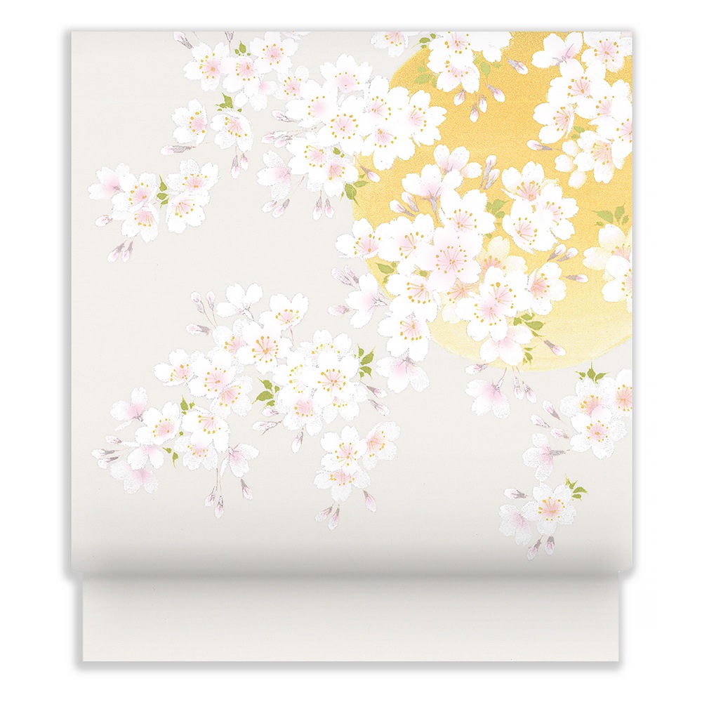 グレー地の夜空に、満開のソメイヨシノが満月を背景に咲き誇る、幻想的なデザインの新塩瀬帯です。金彩で描かれた月は光の加減でまばゆく輝き、背景と桜の淡くやさしいコントラストが目を惹きます。またお太鼓の柄は、満月の位置を変えることで違った雰囲気が楽しめるのも、この柄の特徴。お花見や春の行楽に締めたい、おすすめの柄行です。
