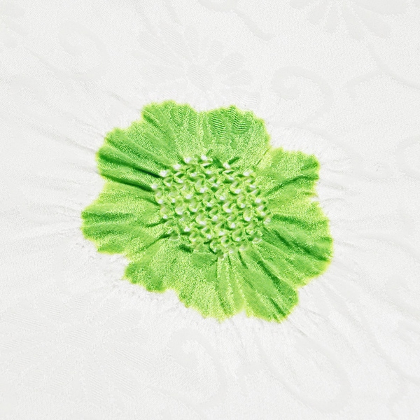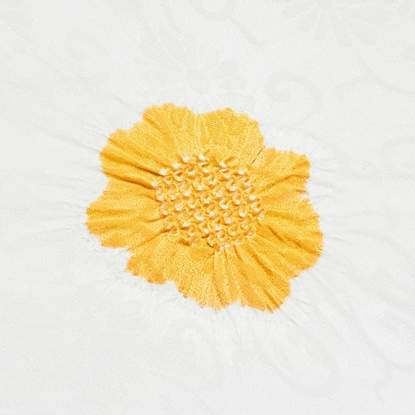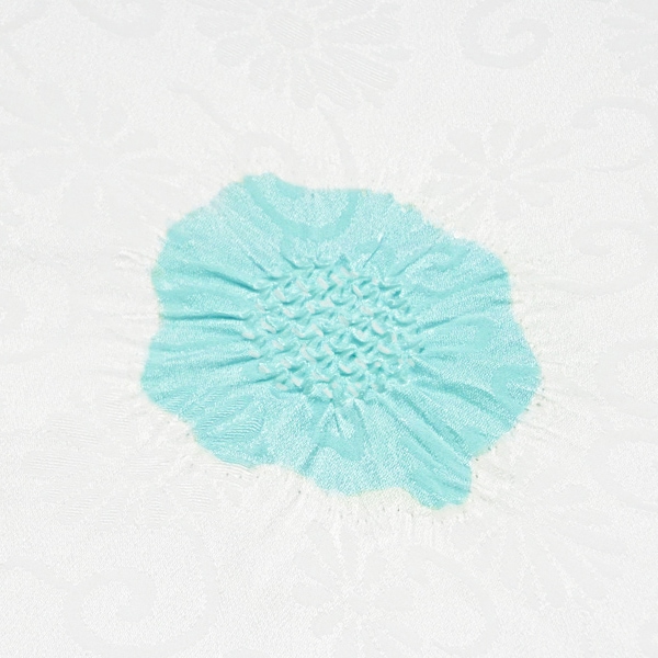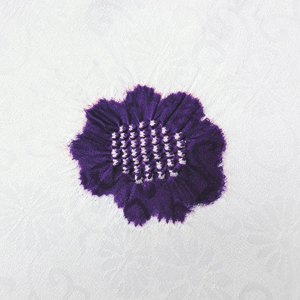 菊唐草の紋綸子の生地に、風雅な彩りの梅と楓の絞りを散らした、京都ならではの逸品です。
